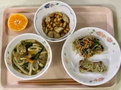 大豆と里芋を片栗粉をまぶして揚げ、甘辛いしょう油ダレで和えた献立は、苦手な豆をたくさん食べられる、給食ならではのおいしさです。