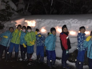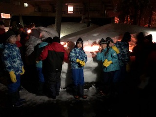 1日目の夜は、雪どうろうをしました。雪の壁に穴を開けてロウソクを灯しました。とても美しい世界が広がりました。