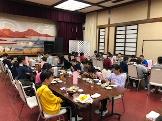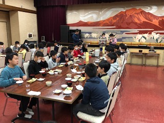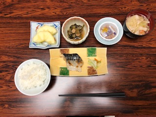 4日目の朝です。朝食は鯖の塩焼き、納豆、豚汁です。宿舎での最後の食事です。みんな味わって食べています。