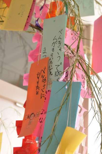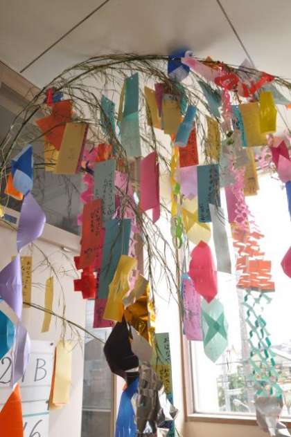 地域の公園で竹を植えて手入れをしていらっしゃるボランティアの方から,1・2年生の各クラスに1本ずつ,笹竹をいただきました。折り紙などを使って飾りつけをして,短冊に願い事を書きました。みんなの願い事がかないますように。
