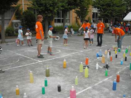 かき氷、よーよーすくい、ボーリング、わなげ、ゴルフ、シャボン玉などたくさんの出し物がありました。子どもたちはパスポートを持ってまわります。天候にも恵まれ、とても楽しく過ごすことができました。たくさんの保護者の方々にも協力していただきました。ありがとうございました。