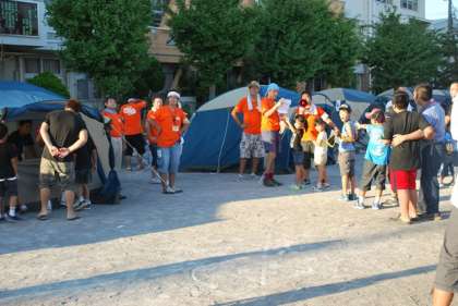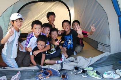 今回は初めて,区の防災テントをお借りして,実際に校庭に設営しました。夜,泊まるのも,このテントです。お父さん・お母さんたちの協力で,20ほどのテントが次々と建っていきました。