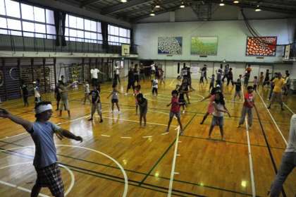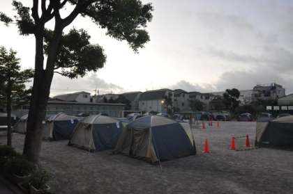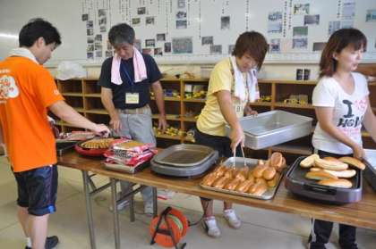 朝は,5時頃から目を覚ましていた子どもたち。明るくなるにつれ,あちこちのテントから楽しそうな声が聞こえてきました。その頃,お父さん・お母さんたちは朝ごはんの準備。子どもたちのために,見えるところ・見えないところで大活躍でした。6時半からラジオ体操,気持ちよく一日がスタートできました。