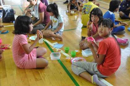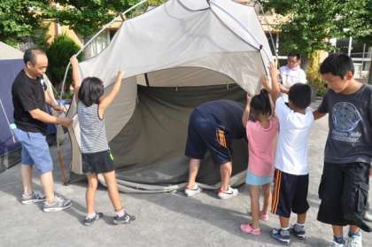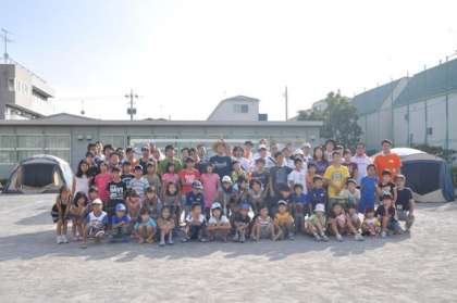 おいしいホットドックを食べたら,楽しかったお泊まり会もいよいよ終わり。みんなが泊まったテントはみんなで片づけて,最後に記念撮影。お天気もよく,貴重な体験がたくさんできました。