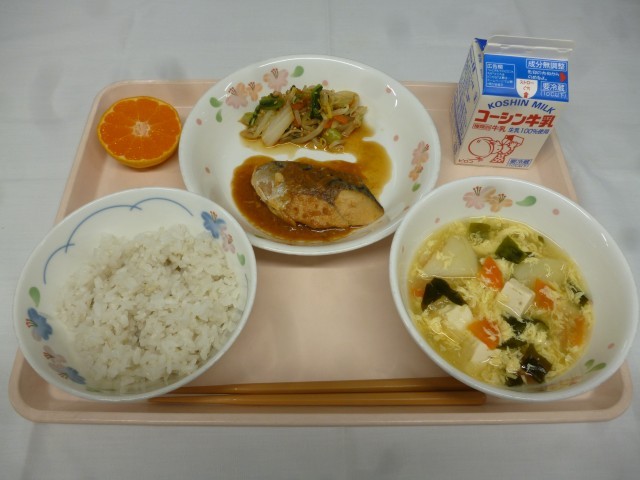 ごはん 鯖の味噌煮 小松菜と白菜のごまおかか和え わかめのかきたま汁 みかん