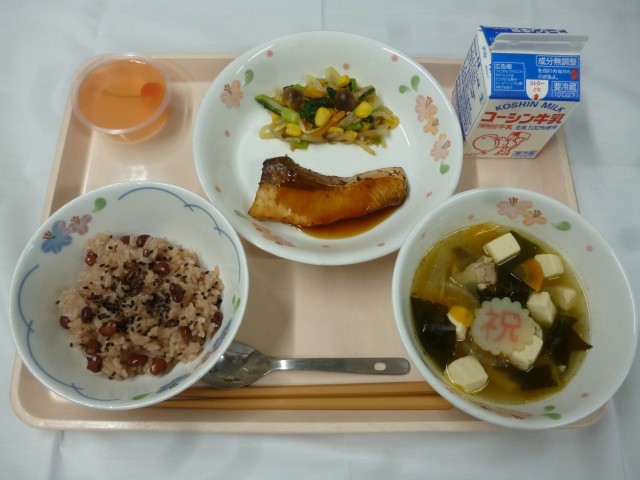 開校記念お祝い献立お赤飯 ぶりの照り焼き 五色和え お祝いすまし汁 お祝い寒天 ...