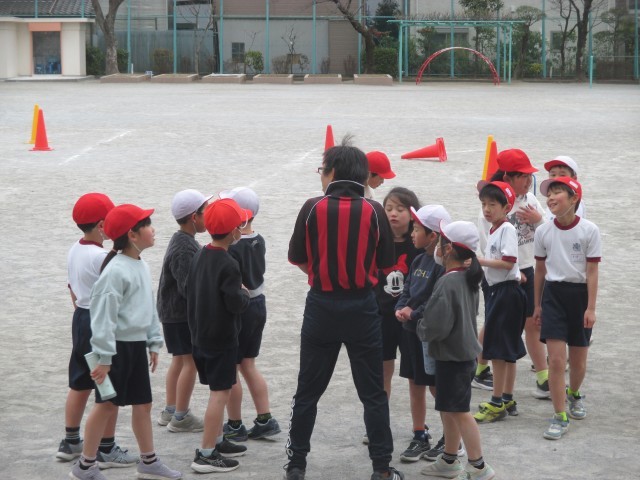 3年生が体育でコーン倒しゲームに取り組んでいました。コーンを倒すチームと、コーン...