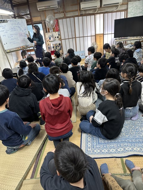 東京染めものがたり博物館でお話しを聞いています。この後、染めもの体験をします。