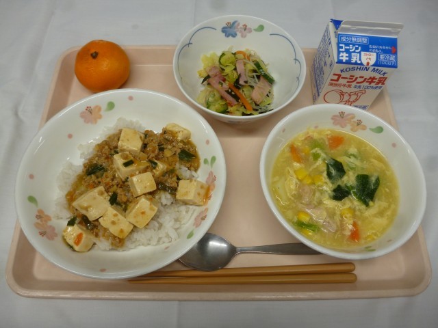 マーボー丼 中華サラダ ユイミータン みかん 牛乳