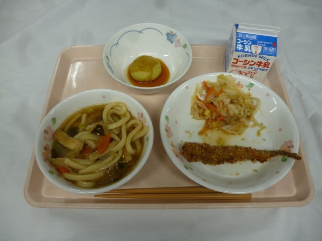 肉うどん ししゃもフライ もやしとツナの和え物 いも団子 牛乳