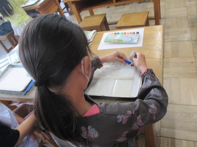4年生が、お気に入りの色の組み合わせでにじみ絵を描いていました。パレットに一色づ...