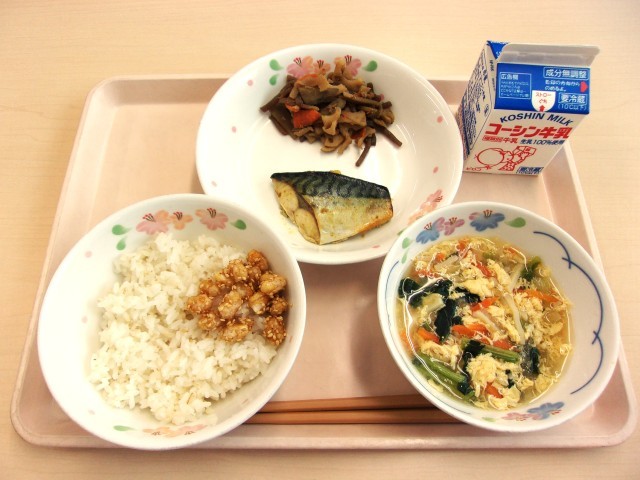 ごはん、揚げ大豆のごまがらめ、牛乳、鯖のカレー醤油焼き、ごぼうとれんこんのみそ炒め、千切り野菜のかきたま汁
