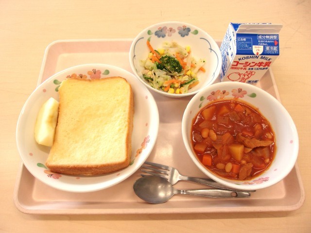 『ポークビーンズ』は、アメリカの代表的な家庭料理のひとつで、豚肉と豆をトマトベースでじっくり煮込んで作る料理です。アメリカでは、豆は白いんげん豆を使うことが多いそうなので、給食でも白いんげん豆を使って作りました。豆が苦手な児童は多いですが、今回の『ポークビーンズ』では、他の具材と一緒に食べている様子が見られました!