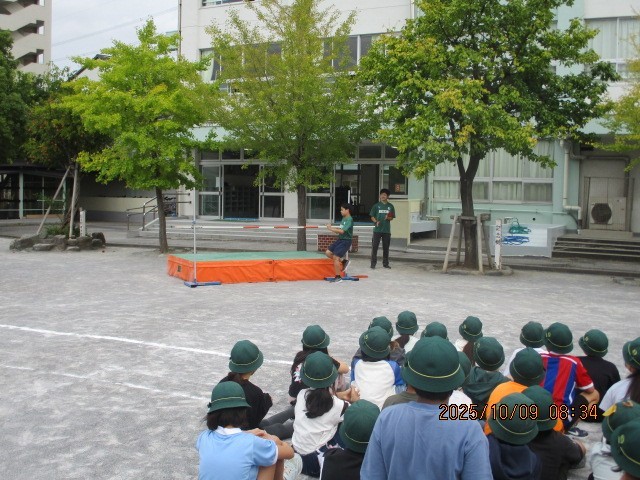 最初に種目別にリーダーが意気込みを語り、その後高跳びと100m走の実演がありました。