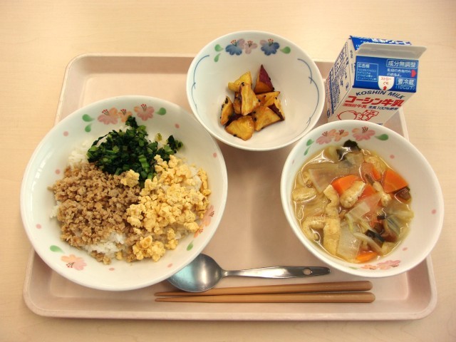 三色丼、飲用牛乳、大学芋、なめこと白菜のみそ汁