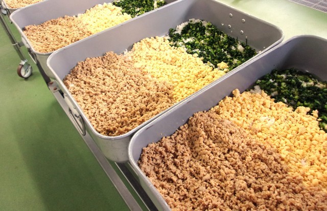 『三色丼』の具は、豚ひき肉と大豆を使ってそぼろを作り、たまごで炒り卵を作り、小松菜を茹でてから冷やし、味をつけたものをご飯の上に盛り付けました。