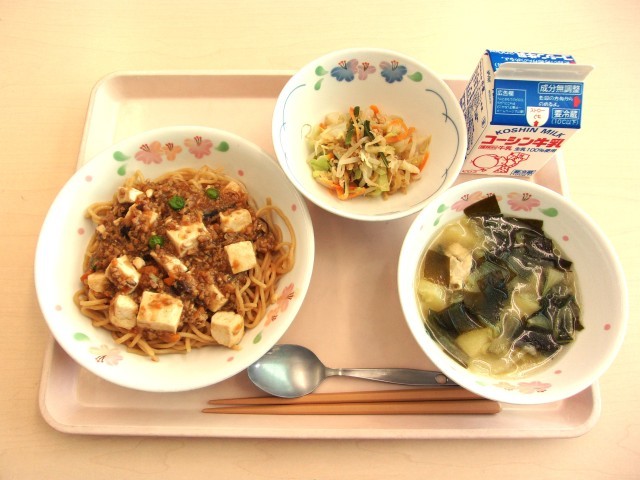 マーボー焼きそば、牛乳、茎わかめともやしの中華和え、青梗菜のスープ
