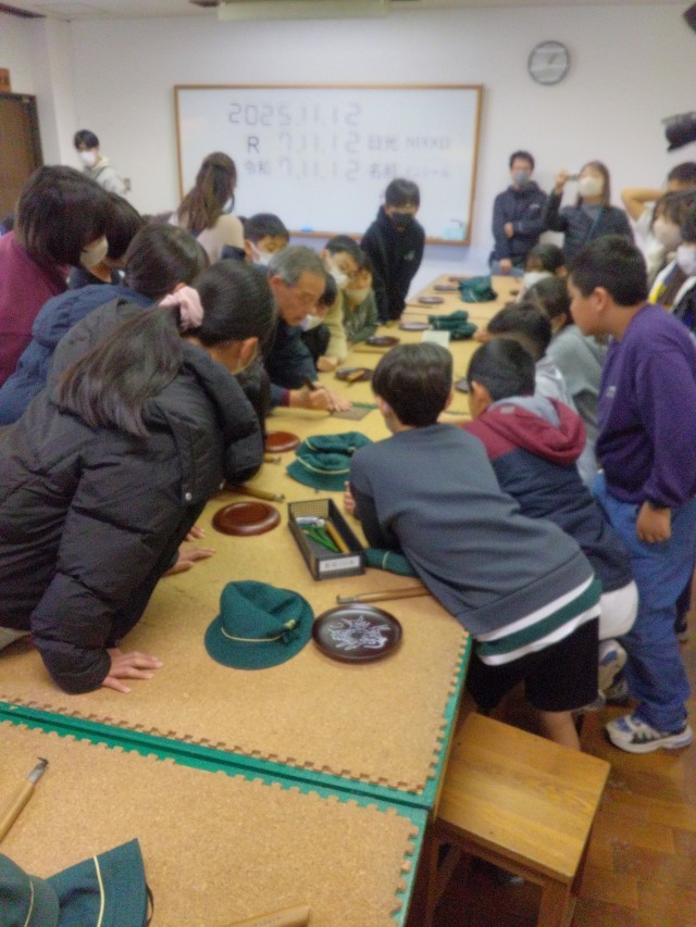 初めての日光彫りにみんな真剣に取り組んでいます。彫刻刀とは違い、手前に引く技に慣れないようですが、少しずつコツをつかんできています。