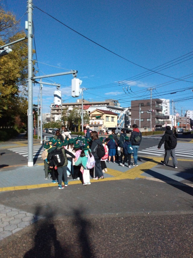 紅葉の中、歩いて行船公園に向かいます。みんなでしっかり並んで安全に向かいます。