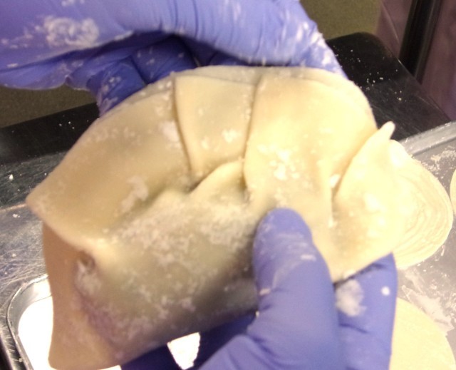 『ジャンボ揚げ餃子』は、豚ひき肉、鶏ひき肉、キャベツ、ニラ、にんにく、しょうがなどの食材に調味料を加え、一つ一つ餃子の皮に包み、油で揚げて作りました。