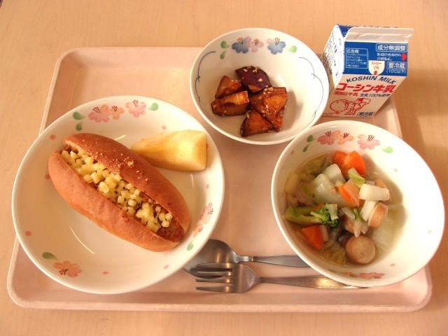 カレーミートチーズドッグ、牛乳、白菜と大根のスープ煮、さつま芋のアーモンド揚げ、りんご