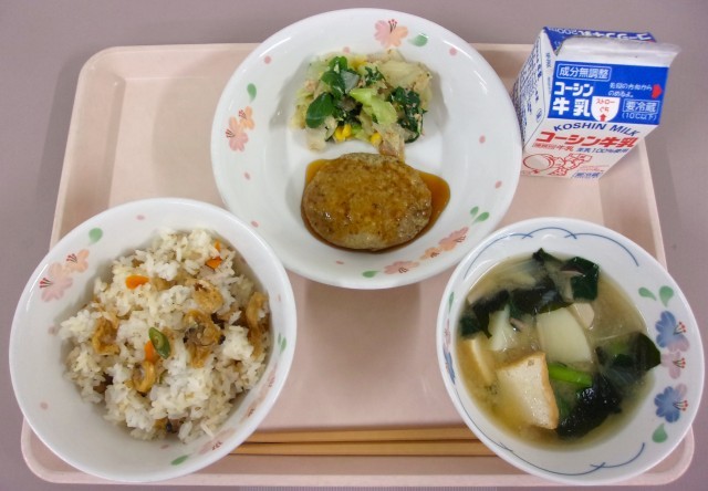 深川めし、牛乳、むろあじのハンバーグ、あしたばとツナ和え、大根と小松菜のみそ汁