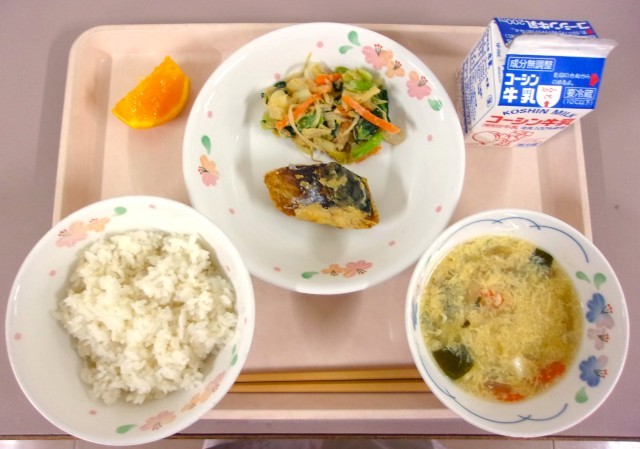 ごはん、牛乳、さばのから揚げ、小松菜のごま和え、わかめのかきたま汁、デコポン