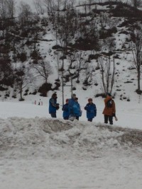 スキー班に別れて練習が始まりました。まずは、靴の履き方、スキーの付け方、そして片足で歩くなど、基本から教わっています。