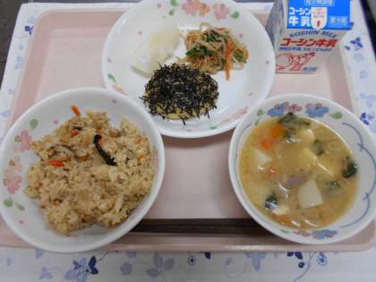 今日の給食は、きのこご飯、すり身の磯焼き、くるみ和え、味噌けんちん汁、梨でした。今日は秋を感じさせる献立です。魚のすり身には、タラを使いのりをつけて焼きました。きのこご飯には、まいたけ、しめじ、しいたけ、えのきの4種類のきのこの他に、大豆、油揚げ、鶏肉、ごまが入り具だくさんのご飯でした。