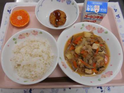 今日の給食は、ご飯、すき焼き風煮、小松菜入りいももち、菊花みかんでした。すき焼き風煮は、一皿で栄養がしっかりとれます。肉、焼き豆腐のたんぱく質、たっぷりの野菜やきのこで、ビタミンや食物繊維などがとれます。しっかりした味付けでごはんも進む一品です。子供たちも残さず食べていました。
