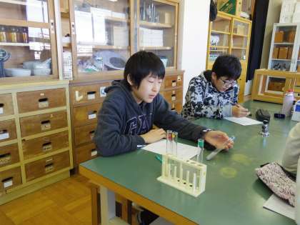 理科の学習です。塩酸、水酸化ナトリウムに鉄を入れるとどうなるのか実験をしています。泡が出始めてびっくり・・・。なぜなのか、実験結果から考察します。