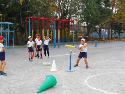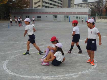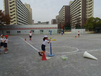 体育の学習でベースボール型ゲームを行っています。みんなで声を掛け合い、寒さを吹き飛ばすぐらい、熱い試合を行っています。