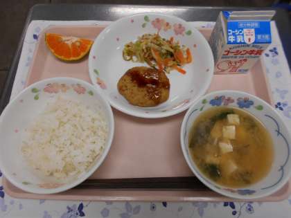 今日の給食は、ご飯、豆腐ハンバーグ和風ソース、きゃべつの香り和え、里芋のみそ汁、早香(果物)でした。「早香」とは、温州みかんとぽんかんの掛け合わせの果物です。ぽんかんの香りとみかんのジューシーさをもっています。やや種が多いのですが、好評な果物でした。