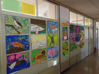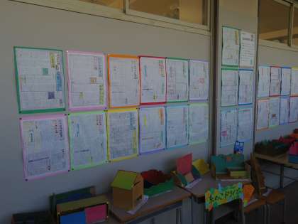 各学年の廊下掲示には、子供たちの作品が展示されています。図工の作品、社会科のまとめなど、どれも学習の成果です。ご来校の際は、子供の様子とともに作品もじっくりご覧いただきたいと思います。