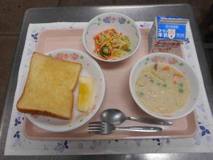 今日の給食は、セサミハニートースト、白菜の肉団子シチュー、ごまドレサラダ、りんごでした。りんごには、クエン酸やリンゴ酸が含まれていて疲労回復に役立ちます。また、食物繊維の一種である水溶性のペクチンも含まれているので、便秘予防の効果にもつながります。