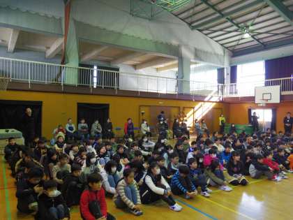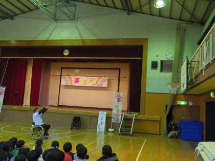 オリンピック・パラリンピック教育の一環として「夢未来プロジェクト」を実施しました。講師は、アスリートの京谷和幸先生です。京谷先生から「夢・出会い・感謝」をテーマにお話をいただきました。夢をもつ大切さ、出会いの喜び、そして人に対する感謝。温かい話の後は、車椅子バスケットボールの実演をしてくださいました。