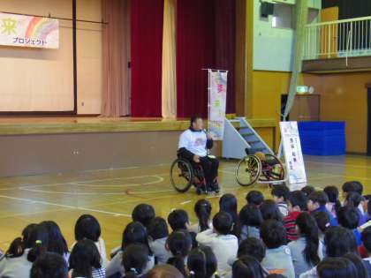 オリンピック・パラリンピック教育の一環として「夢未来プロジェクト」を実施しました。講師は、アスリートの京谷和幸先生です。京谷先生から「夢・出会い・感謝」をテーマにお話をいただきました。夢をもつ大切さ、出会いの喜び、そして人に対する感謝。温かい話の後は、車椅子バスケットボールの実演をしてくださいました。
