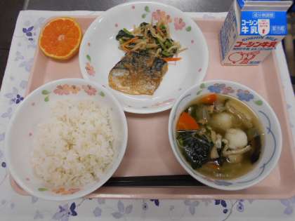 今日の給食は、ご飯、さばの味噌煮、小松菜のごま和え、だまこ汁、菊花みかんでした。だまこ汁は秋田県の郷土料理です。だまことは「ご飯をつぶして丸める」という意味の「だま」に秋田の方言の「こ」がついたものです。秋田は米どころなので、きりたんぽやだまこなどの米を使った料理が多くあります。