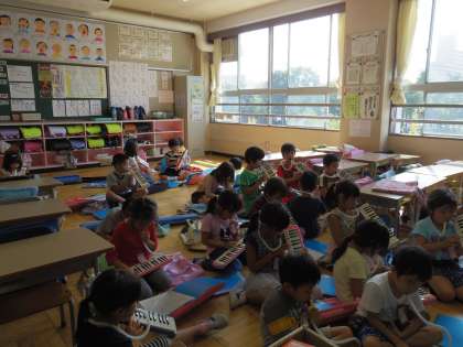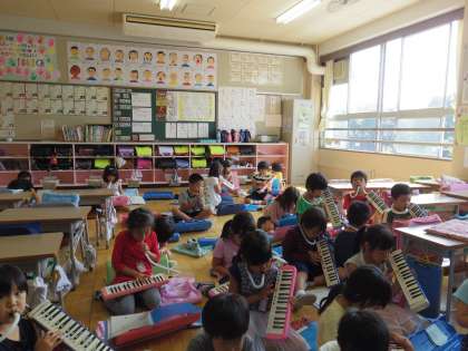 1年生が、音楽会に向けて聖者の行進のけんばんハーモニカを練習しています。みんなで合奏ができるぐらい上手になってきました。