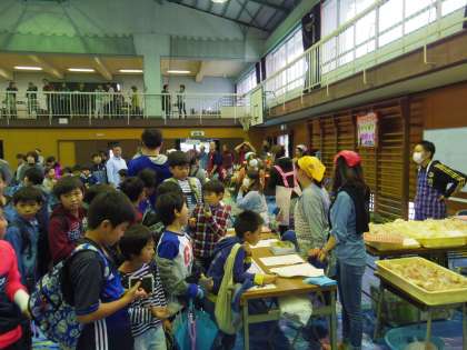 PTA親子まつりが行われました。校庭が雨で使えず、体育館での開催となりましたが、みんなのパワーで盛り上がりました。オープニングでは、すくすくスクールのウエルカムダンスがあり、模擬店ではおいしい食べ物がたくさんあり、遊びコーナーも盛り上がりました。