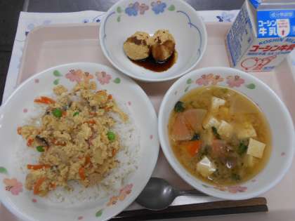 今日の給食は、親子丼、きのこのみそ汁、ごま白玉団子の黒みつかけでした。ごま白玉団子はすりごまを入れた白玉団子にきな粉をまぶして、黒みつをかけました。お団子が好きな児童が多く、喜んで食べていました。