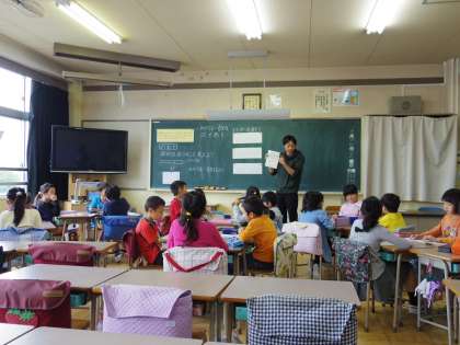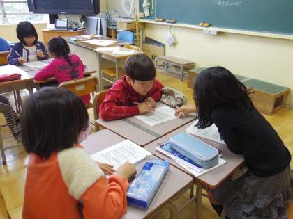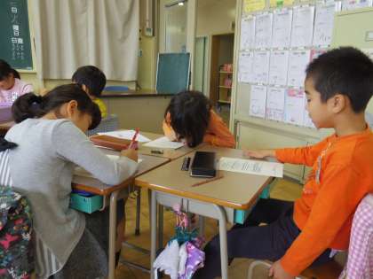 3年生が算数の時間、□を使った式を学習しています。数直線を使って、どのような式を立てればよいのか話し合って考えました。