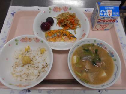 今日の給食は、栗ご飯、鮭のもみじ焼き、茎わかめの変わり炒め、豚汁、巨峰でした。今日は秋らしい献立です。栗ごはんにはもち米も入りました。鮭のもみじ焼きはマヨネーズに、にんじん、黄色のパプリカでもみじをイメージしました。