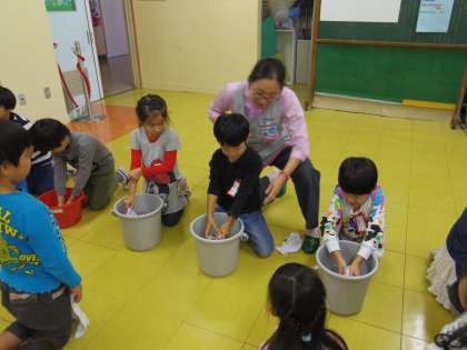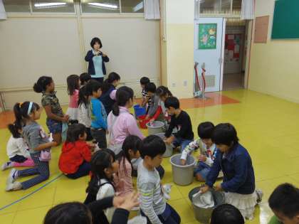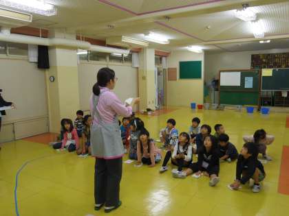 1年生がおそうじをもっと上手に行うための、きれいのたねまき教室を行いました。ダスキンの人が来てくれて、ほうきの正しい使い方やぞうきんのしぼりかたを教えてもらいました。今日、教えてもらったことをいかして、上手におそうじをします。