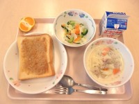 今日の給食は、中華丼、焼き肉サラダ、肉団子スープでした。スープの肉団子には大豆を細かくしたものもたくさん入りました。今日も各クラスほぼ残さず食べていました。