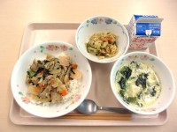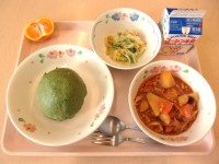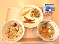 今日の給食は、カレーうどん、ちくわとさつま芋の天ぷら、はりはり漬け、黒糖ミルクもちでした。黒糖ミルクもちはくずでんぷんを使って練って作りました。人気の和食デザートです。
