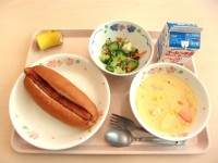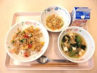ご飯、アーモンドと鶏肉のそぼろ、牛乳、焼き鮭のおろしかけ、きつね和え、いろどり汁、いよかん