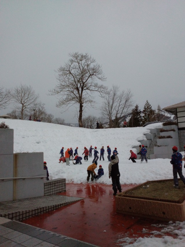 宿舎の前で雪遊びです。遊び始めると降っていた雨も上がり、みんな思う存分遊んでいま...