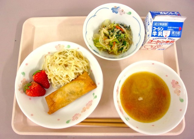 【本日の献立】 野菜たっぷりつけ麺、牛乳、春巻き、中華サラダ、いちご 今日は、6...
