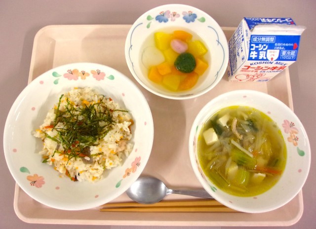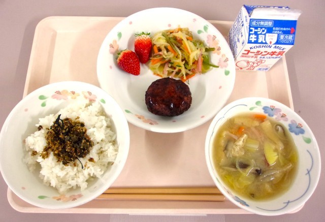 【本日の献立】 ごはん、ごまと小松菜のふりかけ、牛乳、鶏肉と豆腐のつくね揚げ、茎...